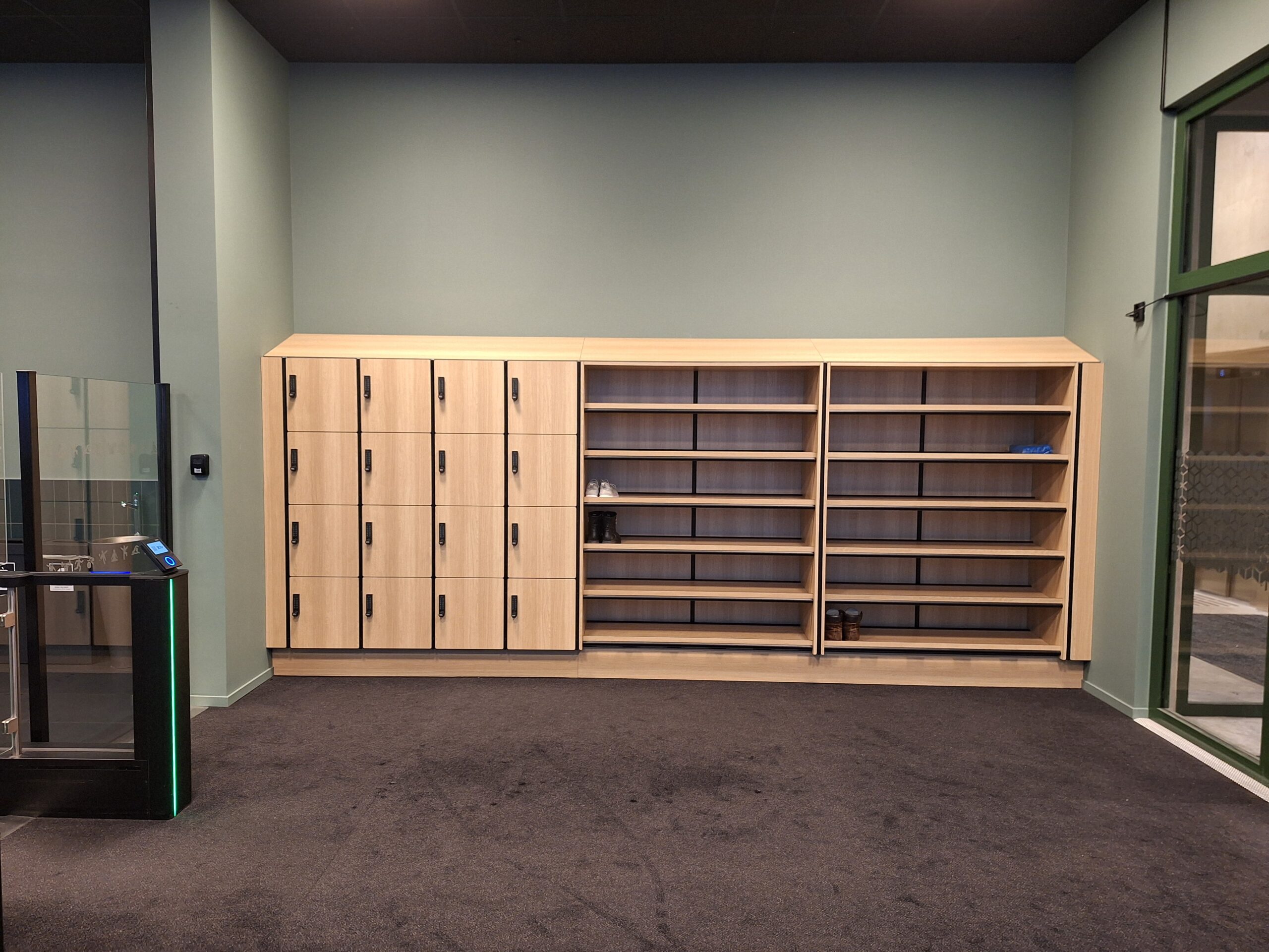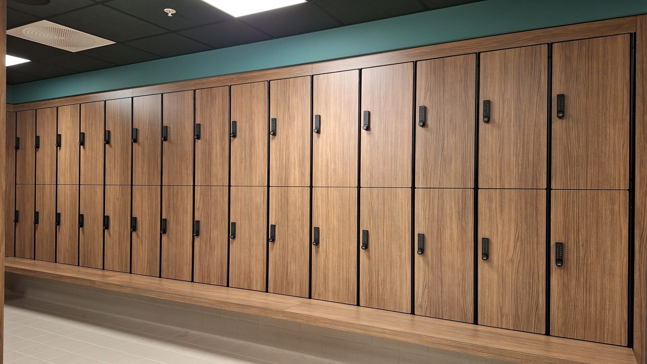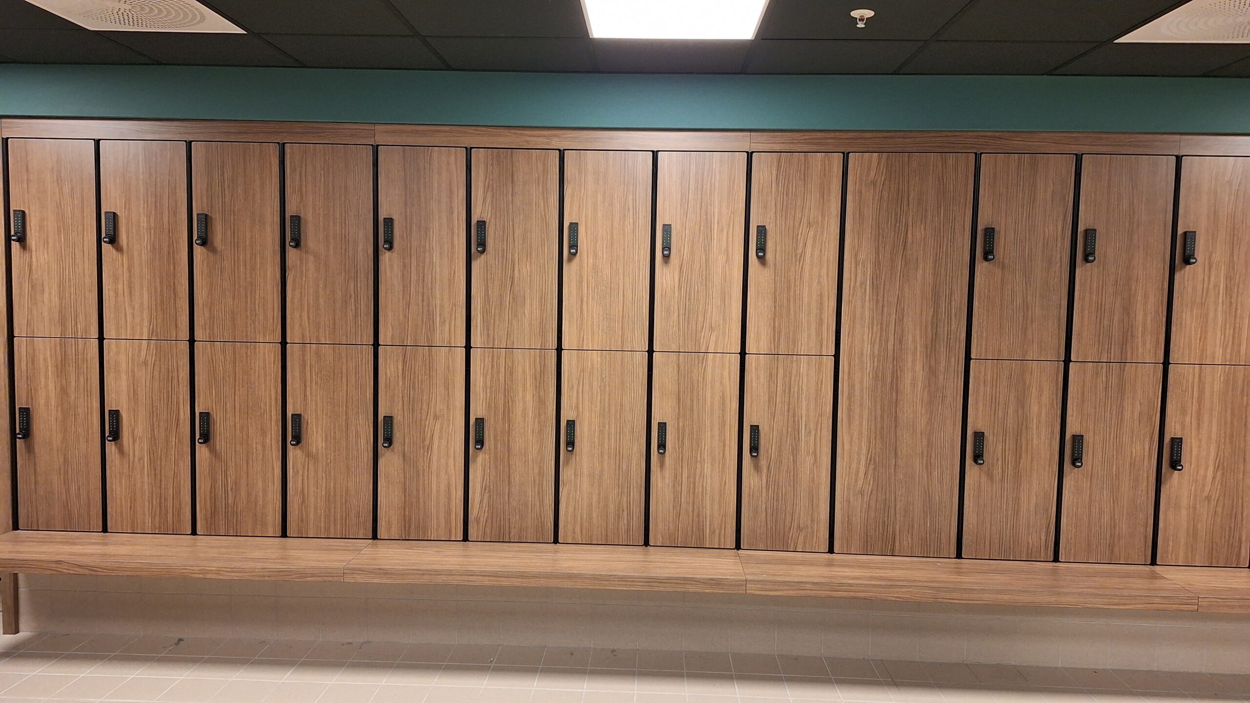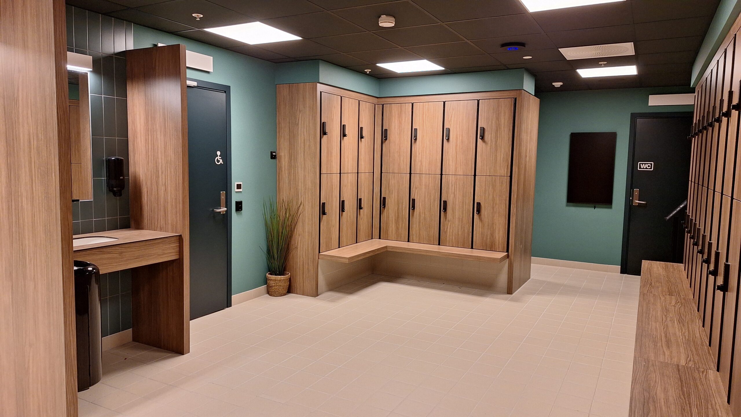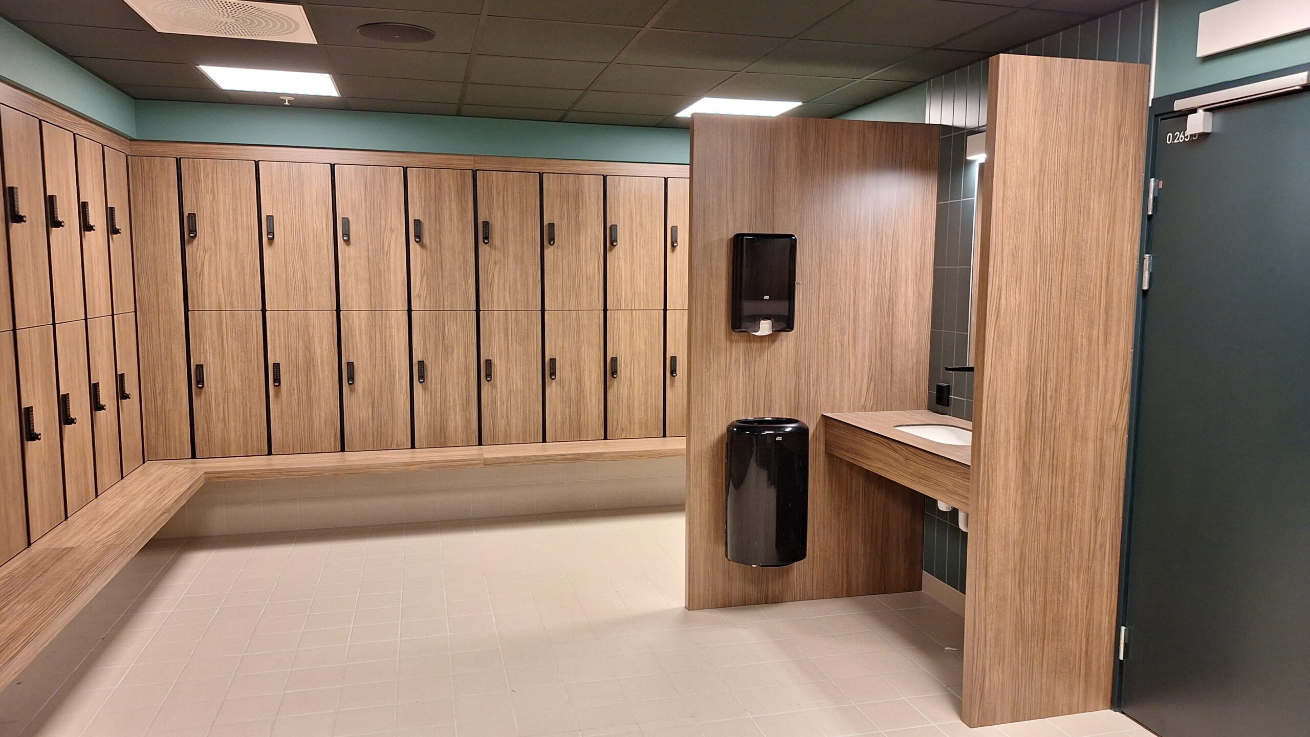 Schwarz eloxierte Profile in Kombination mit Holzoptik HPL schaffen ein elegantes und modernes Design für Umkleiden und Innenräume. Harmonisch abgestimmte Wand- und Fliesenfarben sowie der warme Holzton sorgen für ein stimmiges Gesamterlebnis und eine einladende Atmosphäre für Besucher. Das durchdachte Material- und Farbkonzept verbindet Ästhetik mit Funktionalität und macht jeden Raum zu einer hochwertigen Wohlfühlzone.